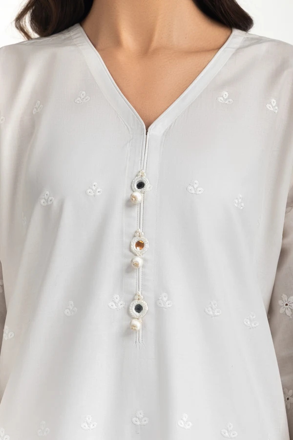 Details: Embroidered Shirt with V – Neckline and Tassels