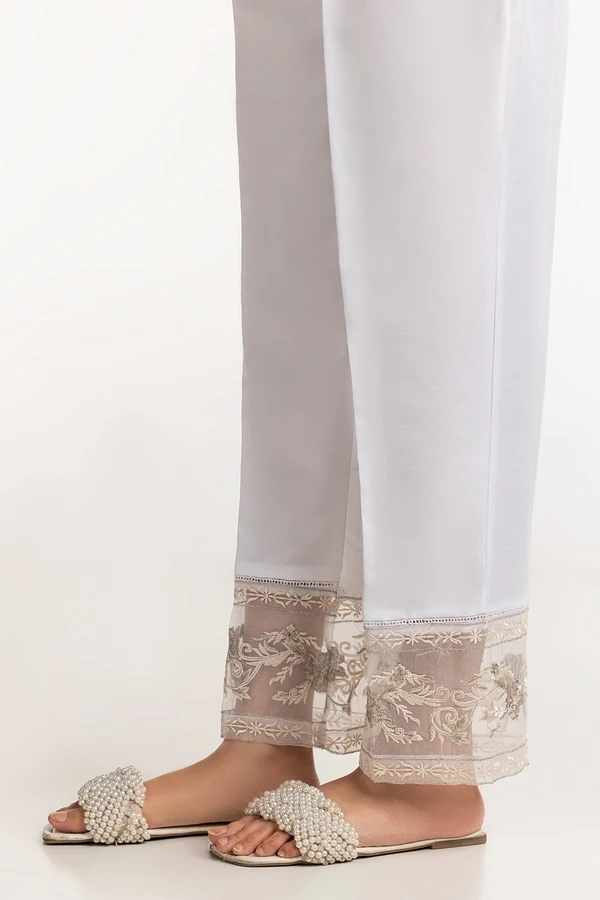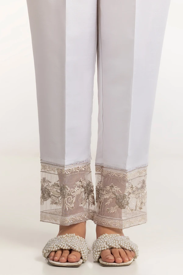 Ready to wear Complete your outfits with this white embroidered raw silk trouser featuring beautiful work on the hem. It’s perfect for elevating your festive style effortlessly.